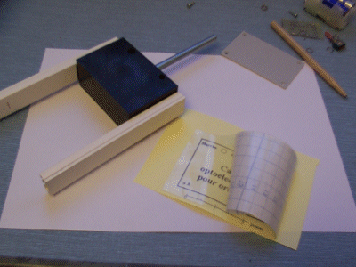 Installez le phototransistor dans l'une des goulottes, la DEL haute luminosité dans l'autre, en vis à vis à 15 mm des extrémités des goulottes. Soudez sur ces composants les fils de liaison venant du circuit imprimé. Placez le circuit imprimé dans l'une des séries de glissières du boîtier.
